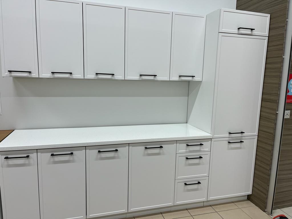 Alumine osa 2,6m: 30cm kapp, 80cm kapp, 50cm kapp, 40cm sahtliboks kolme sahtliga, 60cm integreeritud külmkapikapp. Kappide kõrgus koos jalgadega 82cm, töötasapind 3,8cm.