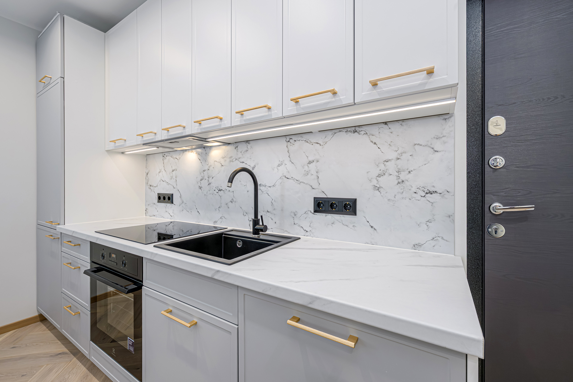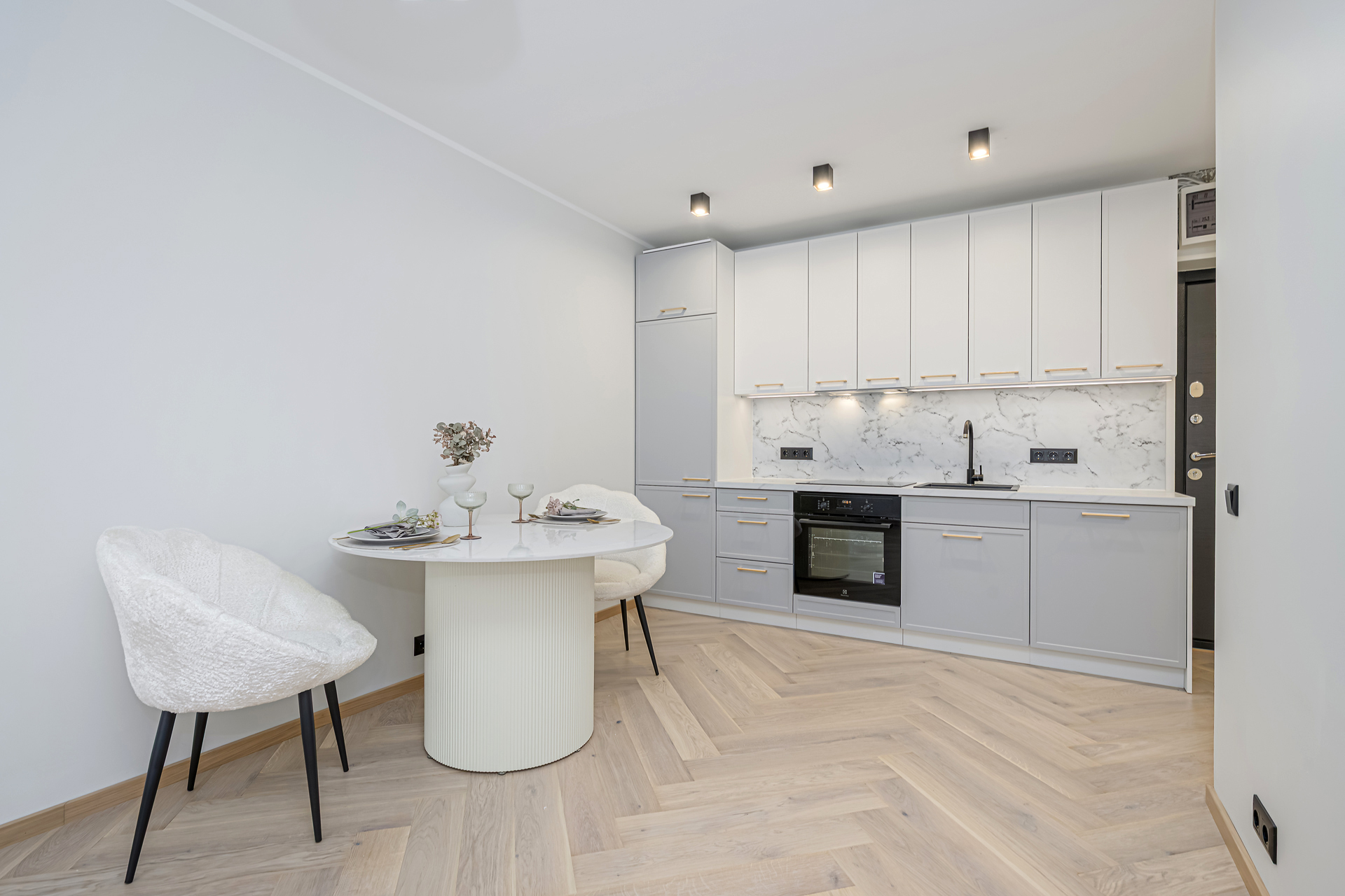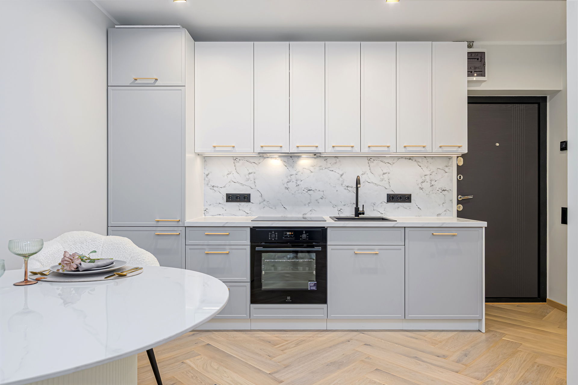 Alumine osa 3m: 60cm integreeritud külmkapikapp, 60cm sahtliboks kolme sahtliga, 60cm integreeritud ahjukapp, 60cm sahtlina avanev valamukapp, 60cm integreeritud nõudepesumasina uks. Kappide kõrgus koos jalgadega 82cm, töötasapind 3,8cm. Külmkapikapi kõrgus 236cm.