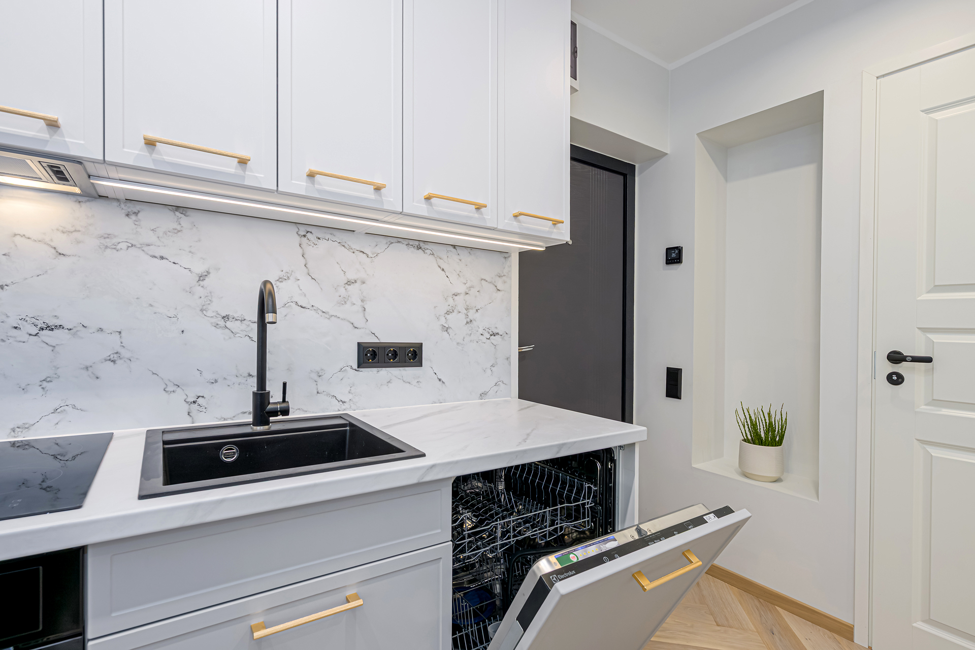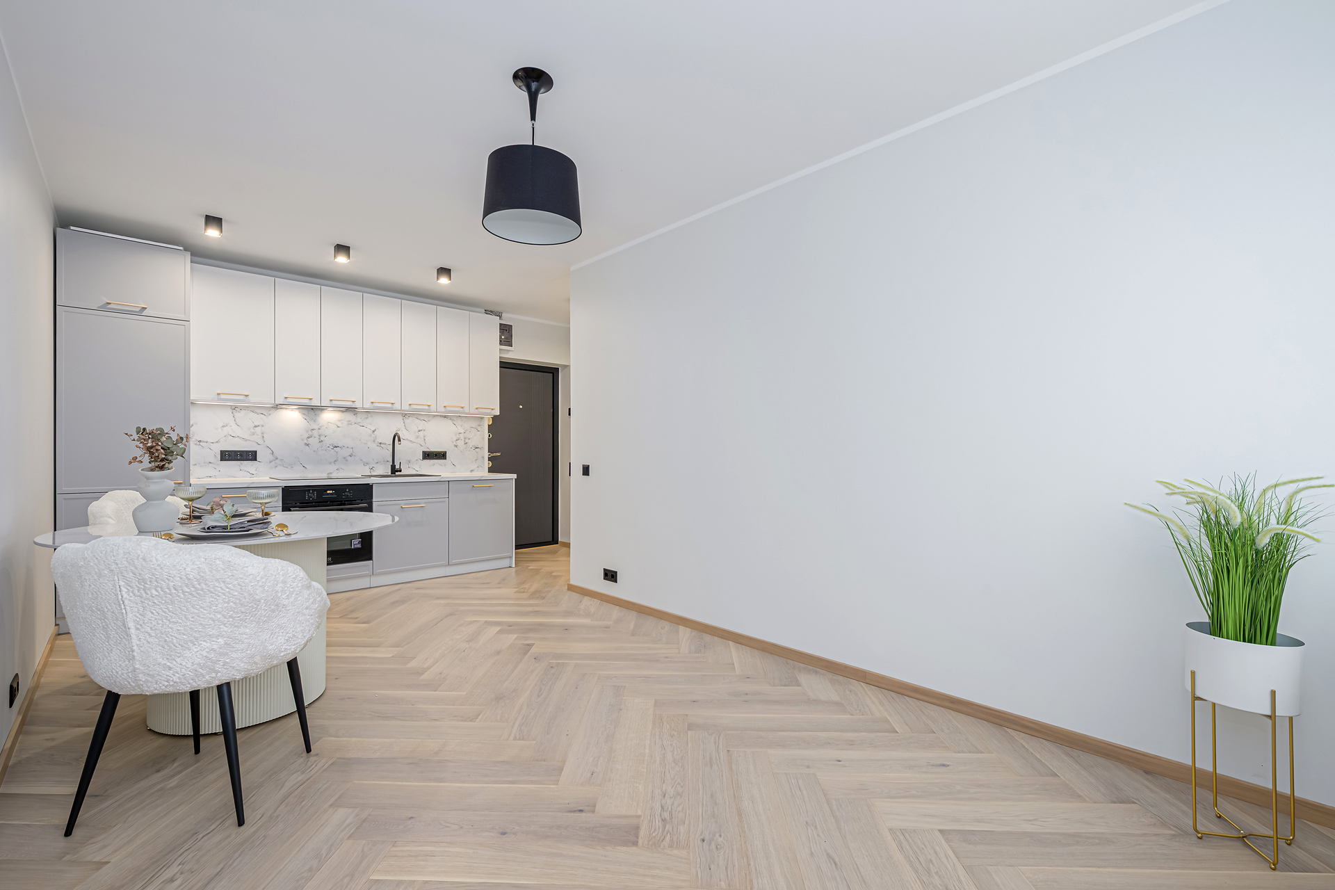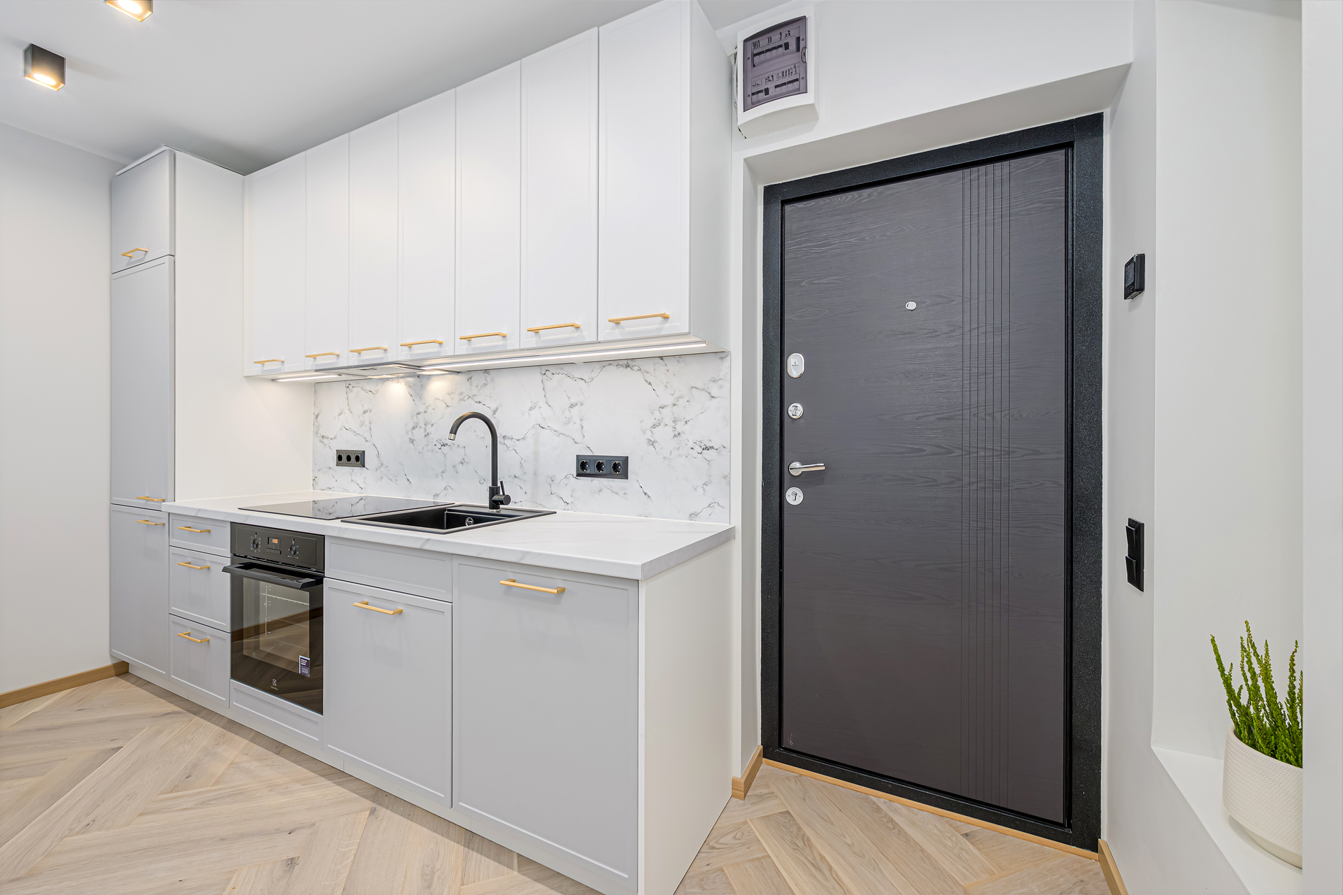 Alumine osa 3m: 60cm integreeritud külmkapikapp, 60cm sahtliboks kolme sahtliga, 60cm integreeritud ahjukapp, 60cm sahtlina avanev valamukapp, 60cm integreeritud nõudepesumasina uks. Kappide kõrgus koos jalgadega 82cm, töötasapind 3,8cm. Külmkapikapi kõrgus 236cm.