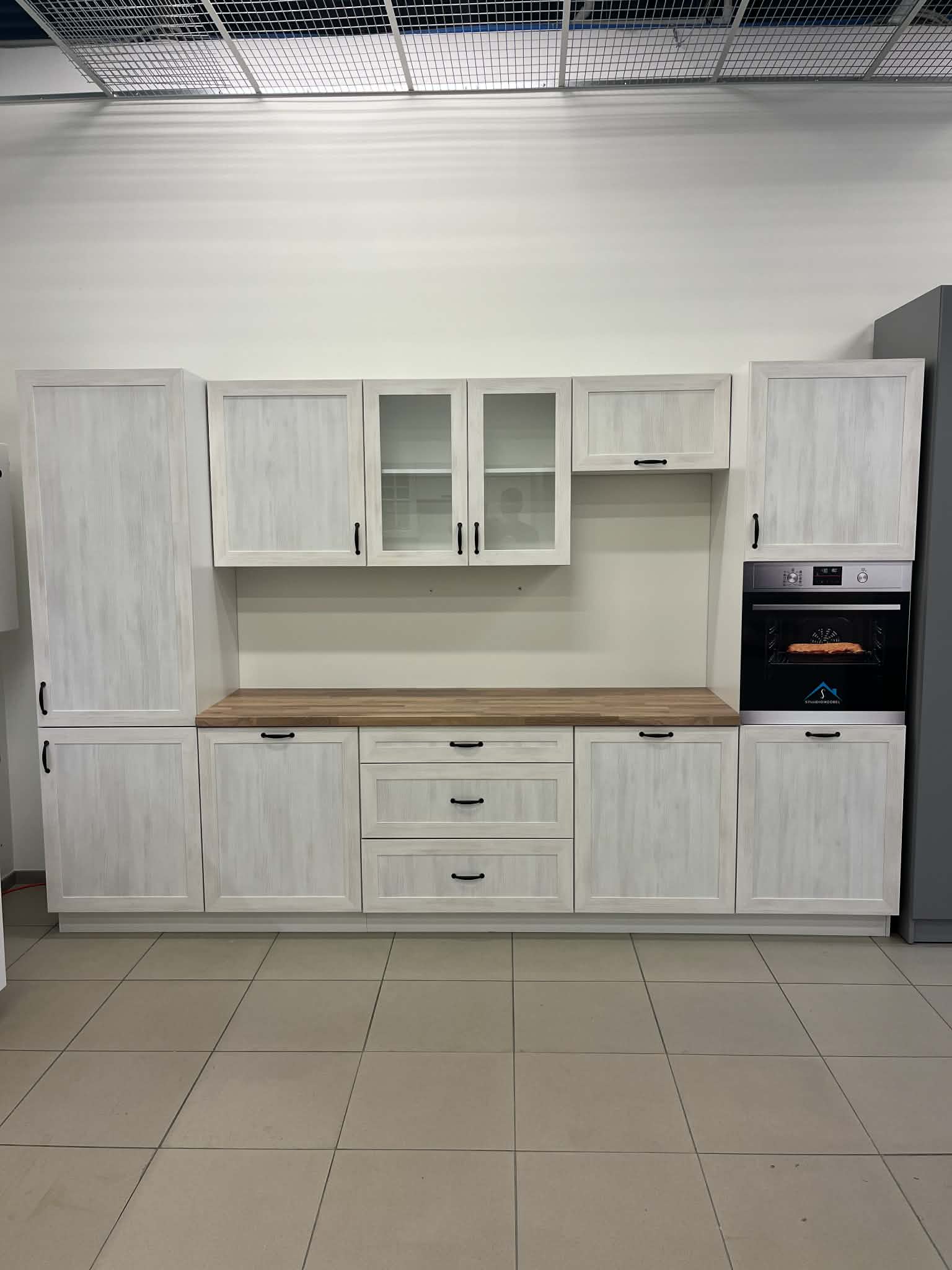 Верхняя часть: шкаф для встроенного холодильника высотой 60 см, однодверный шкаф 60 см, стеклянный шкаф 80 см с двумя дверцами, шкаф 60 см с двумя открывающимися вверх дверцами (подходит для вытяжного вентилятора, высота 36 см), встроенный шкаф для духовки высотой 60 см с грузовой системой. Высота шкафа 72 см, глубина 32 см.